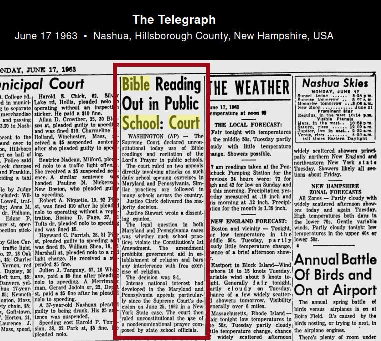Bible Reading Out in Public School: Court WASHINGTON (AP) - The Supreme Court declared unconstitutional today use of Bible readings and recitation of the Lord's Prayer in public schools. The court ruled on two appeals directly involving attacks on such daily school opening exercises in Maryland and Pennsylvania. Similar practices are followed in many schools across the country. Justice Clark delivered the majority decision. Justice Stewart wrote a dissenting opinion. The legal question in both Maryland and Pennsylvania cases was whether such school practices violate the Constitution's 1st Amendment. The amendment prohibits government aid in establishment of religion and bars any interference with free exercise of religion. The decision was 8-1. Intense national interest had developed in the Maryland and Pennsylvania appeals particularly since the Supreme Court's decision on June 25, 1962 in a New York State case. The court then ruled unconstitutional the use of a nondenominational prayer composed by state school officials.